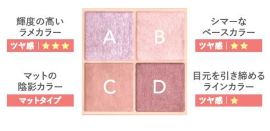 肌馴染み抜群のベージュを基調とした全5色のカラー。ラメ・パール・マットの3質感を重ねて、自然にまぶたを強調し奥行のある大きな目元へ。