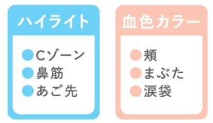 ◆ハイライト・・・Cゾーン、鼻筋、あご先に涙袋にハイライトカラーをON!