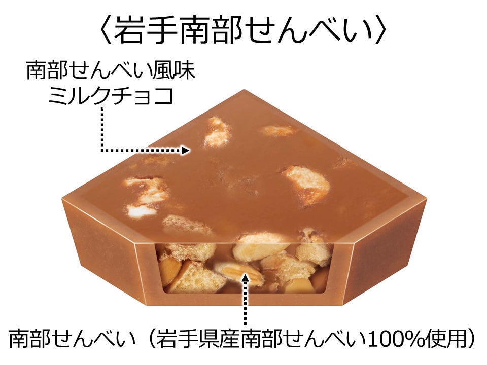 塩味の効いた南部せんべい風味のミルクチョコの中に、岩手県産南部せんべいを混ぜ込みました。ピーナッツの香りと南部せんべいのザクザク食感が楽しめます。