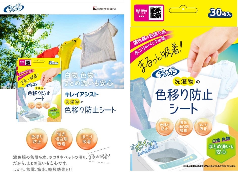 株式会社中京医薬品は、2022年10月11日(火)に吸着力の高い特殊シートが他の洗濯物への色移りや汚れ移りを抑えることができる「キレイアシスト 洗濯物の色移り防止シート」を発売いたしました。