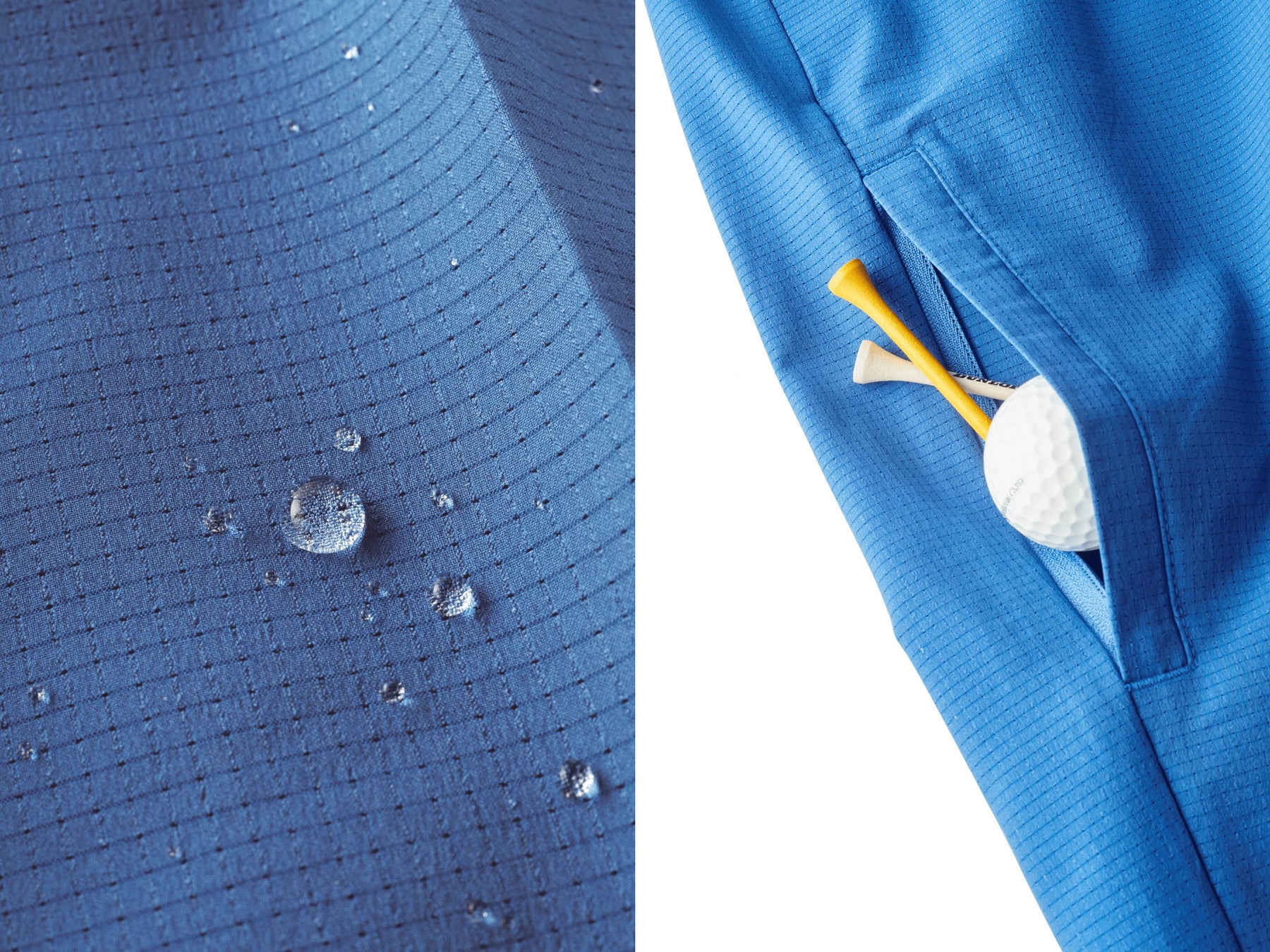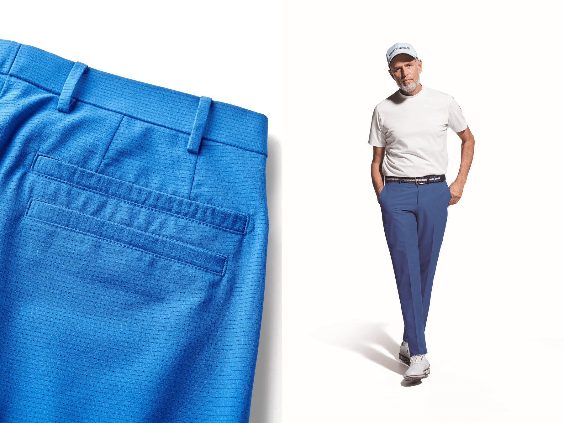 無数の微細な空気孔を持つポリエステル100%の素材「COOL DODSⓇ」を採用した、軽快なパンツ。高いストレッチ性と通気性を備え、歩きやすく、ゴルフ時にご着用も動きがスムーズでプレーの邪魔になりません。シワになりにくく、クリーニング不要。後ろにはスコアカードを収納できるポケットと脇線にはボールやティー用のファスナーポケット付き。さらに撥水加工を施しており、汗を気にせずプレーに集中できます。