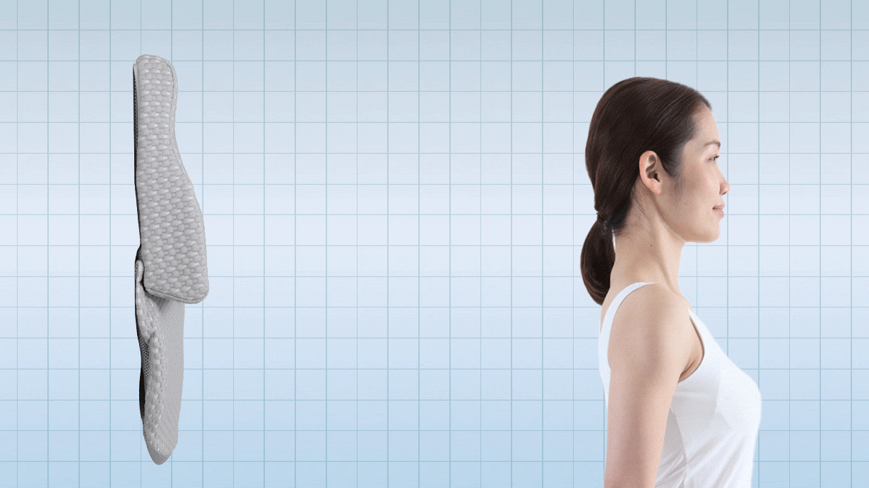 頭・首・肩にかけてかかる重さからの解放はやがて全身離脱。背中を押し伸ばして胸が開き深い呼吸を生み出すための独自3D設計。