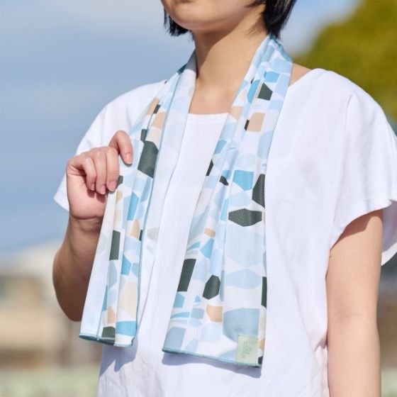 濡らして絞って振るだけでひんやり冷たくなります。ひんやり感が薄れても水分が残っている間は、また振るだけで冷感がよみがえります。濡れてもさらりとした質感で快適な使い心地です。