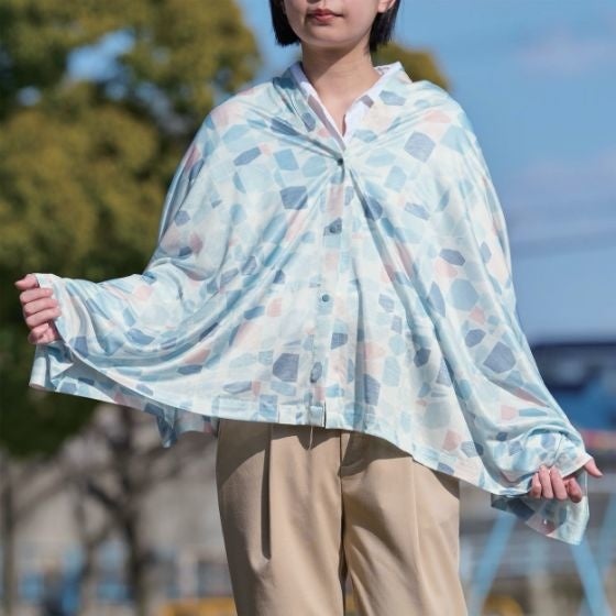 冷感生地がひんやりと心地よく、UVカット率は80%以上です。暑さ対策に使いやすいビッグサイズで、腕も広範囲に覆えるため、暑さ対策とあわせて腕のUVケアにも最適です。ボタンを留めるとポンチョとしても使用できます。本体にポケットが付いていて折りたたんで収納できるので、持ち運びに便利で、バッグの中に入れておけばとっさの時にも使えます。
