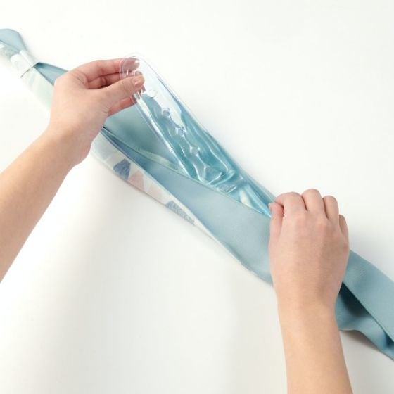 冷感生地と薄くて軽い付属のアイスジェルがひんやり感を高めます。専用ポケットに付属のアイスジェルを入れてお使いいただけます。アイスジェルは重くなりすぎない空洞設計で快適な着け心地です。アイスジェルは冷凍庫で1~2時間冷やしてご使用ください。