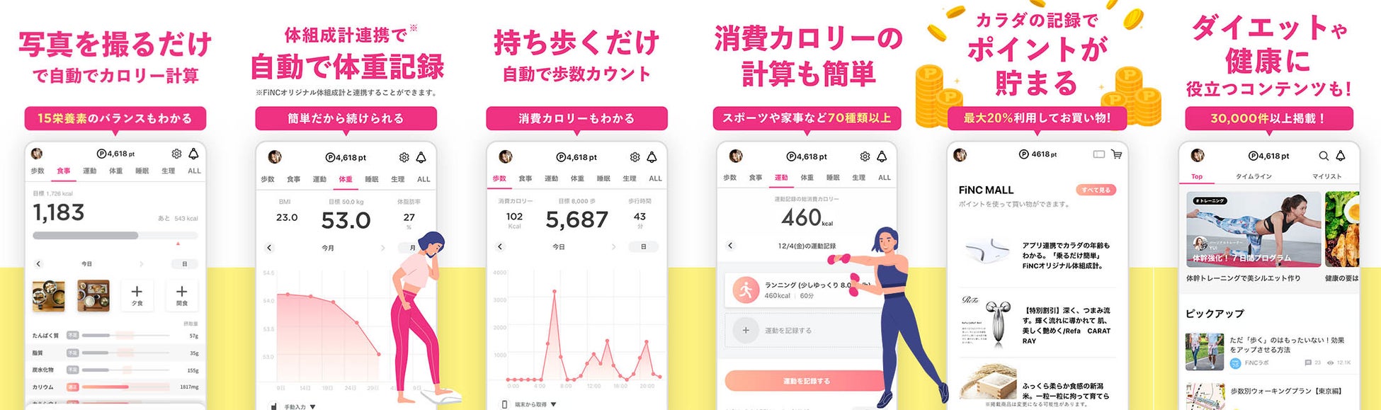 アプリをダウンロードして、スマートフォンを持ち歩くだけで毎日の歩数が貯まり、体重・睡眠時間・食事といったライフログの記録や、歩数に応じて、FiNC MALLで使用できるポイントが付与されます。また著名なアスリート・トレーナー・栄養士といった専門家が発信するエクササイズ・ストレッチ・ヘルシーレシピ・ヨガといった動画コンテンツや、20万件もの食品データベースをはじめ、様々な栄養及び運動プログラムを内蔵し、パーソナルトレーナーAIが、ユーザーひとり一人の興味や悩みにあったメニューを厳選してお届けいたします。ひとりではなかなか続けられない方でも、楽しみながら続けることができるアプリになっています。