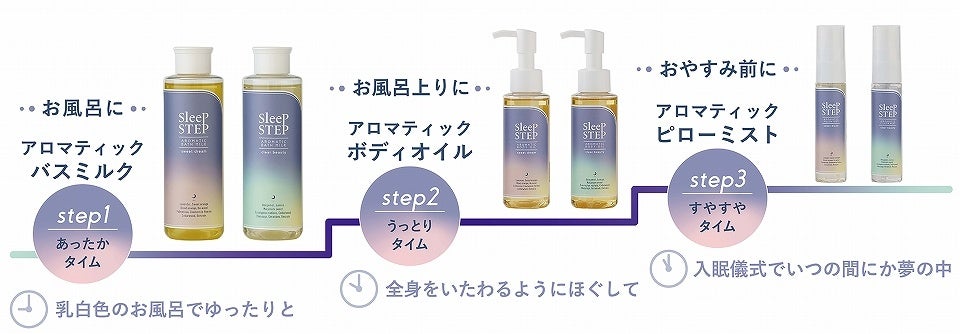 SLEEP STEPは、「睡眠に悩みを抱える多くの方へアロマで寄り添う商品作り」をコンセプトに数年かけて選び抜いたアロマアイテムです。入浴からおやすみ前までをトータルでサポート。「あったかタイム・うっとりタイム・すやすやタイム」を好きな香りで満たされる時間に。簡単3ステップでここちよいおやすみへ。「アロマティック バスミルク」「アロマティック ボディオイル」「アロマティック ピローミスト」の3アイテム。それぞれ2つの香りで展開しています。