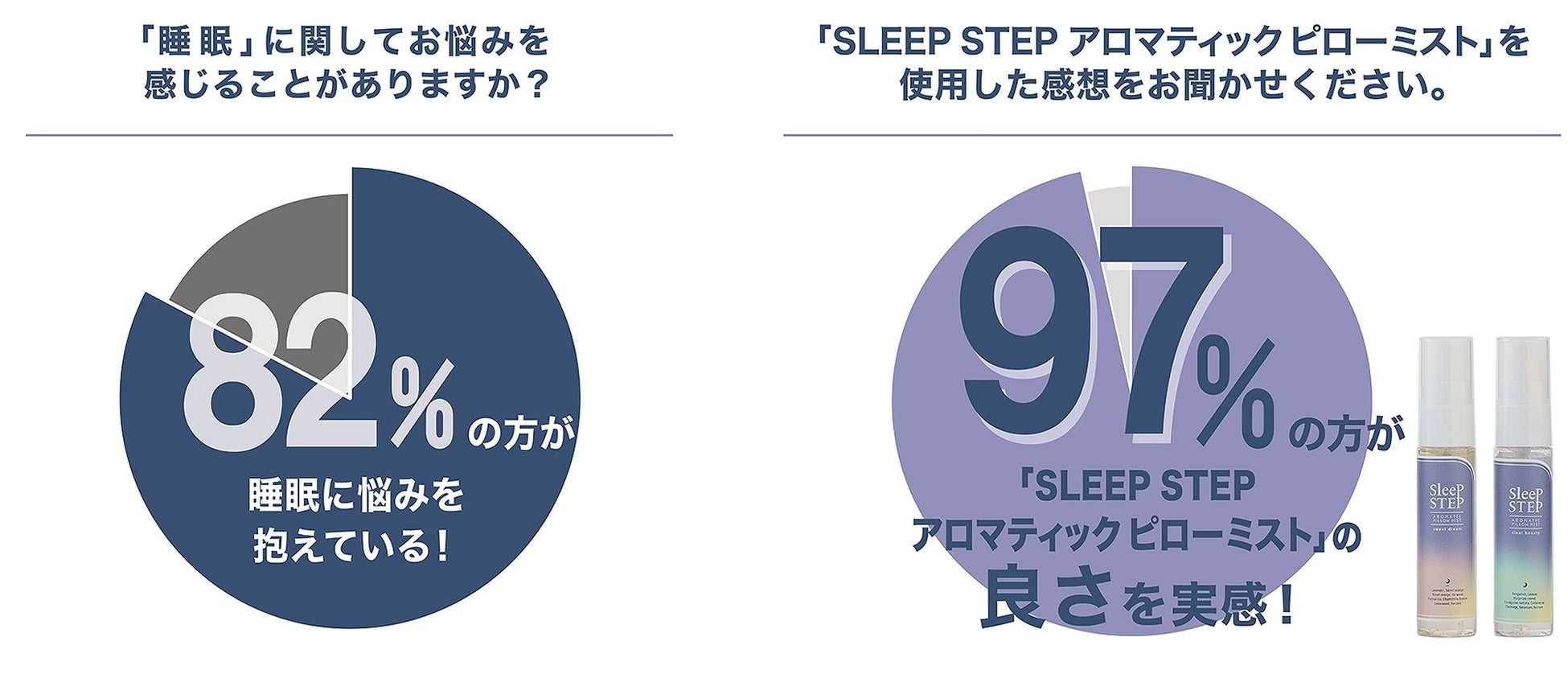 睡眠についての実態・モニター品の使用感をアンケート調査したところ約8割の方が、日頃「睡眠」に関して悩みを抱えていることがわかりました。また、「アロマティック ピローミスト」を使用したところ、97%の方が良さを実感したと回答されました。