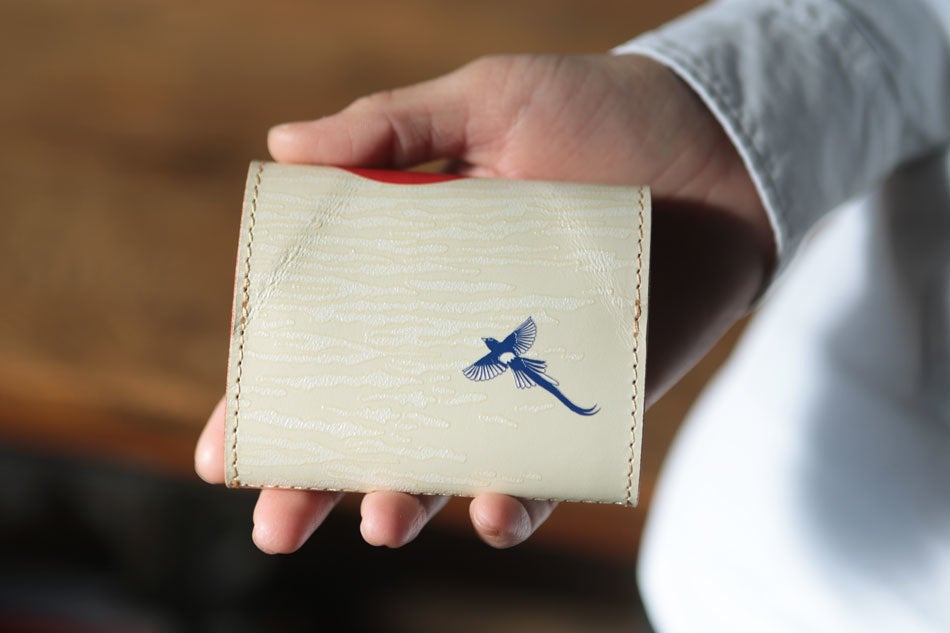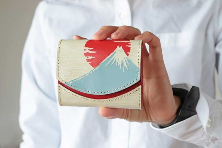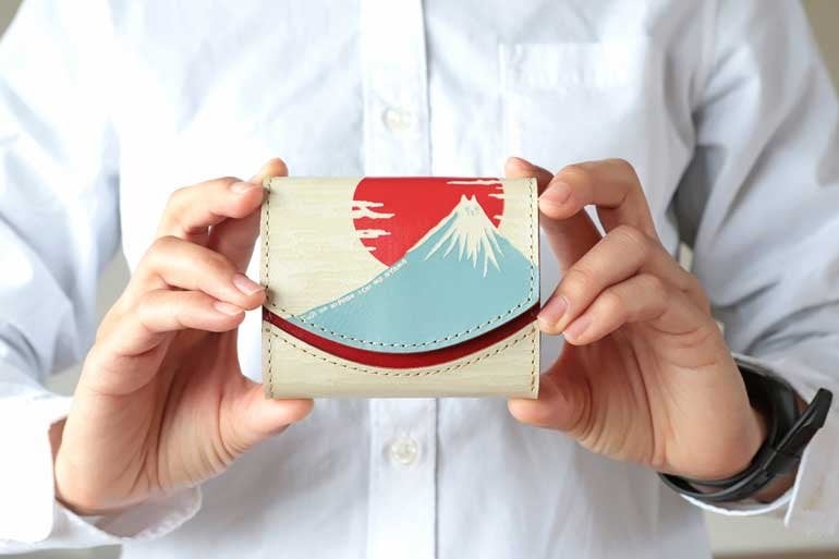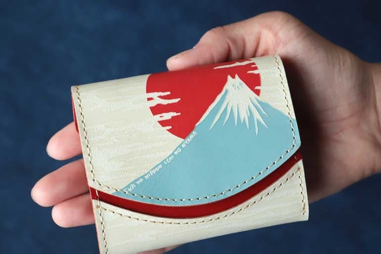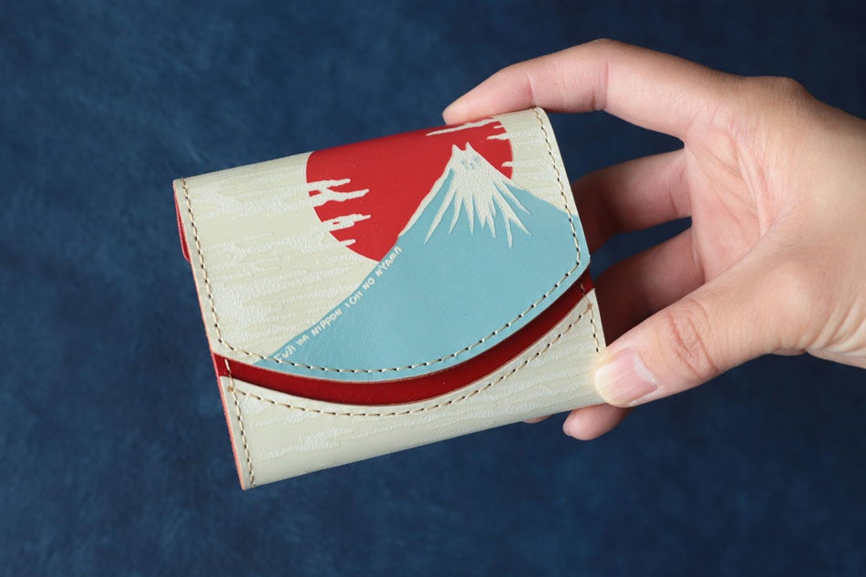 ”47都道府県シリーズ”と題し、岡山県・福岡県・大分県など各都道府県をイメージしたお財布も作っており、今回は静岡県とのコラボ。⽇本⼀の名⼭である富⼠⼭を⼤きくデザインし、裏には静岡県のシンボル「三光⿃」がはばたいています。