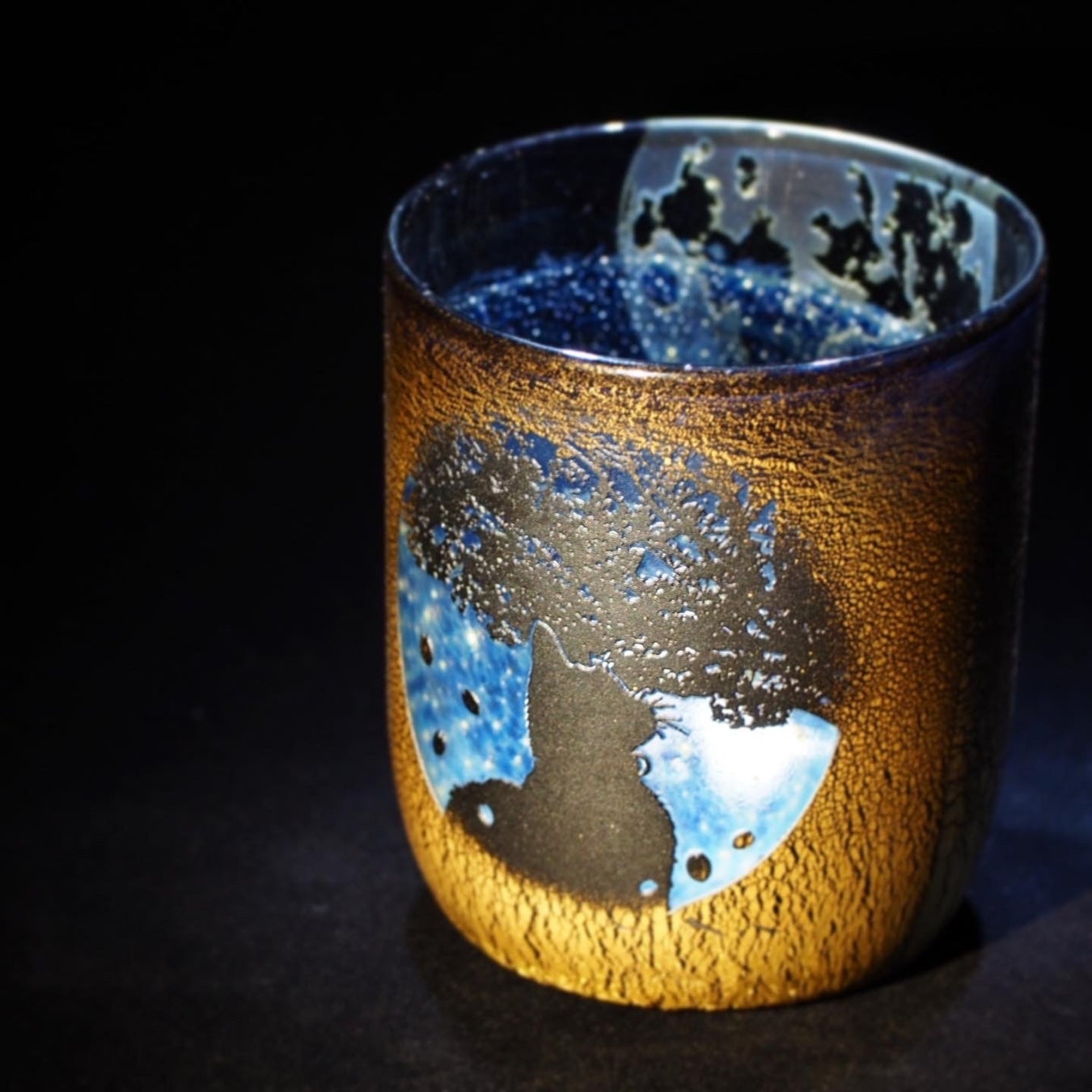 「可夜硝子」春宵猫 金澄幽玄カップ 88,000円幻想的な蒼色に映える猫シルエット。
