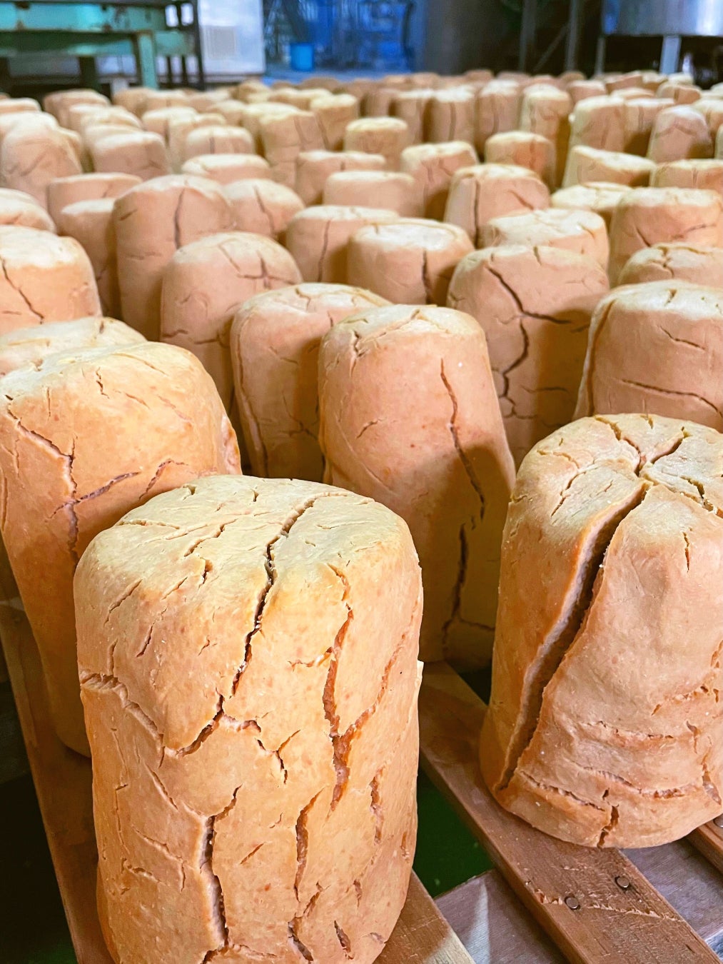 通常は、仕込んだ味噌󠄀を適温に加温して微生物が活動しやすい環境をつくり発酵を促しますが、天然醸造では自然の力にまかせ、人の手を掛けずにじっくりと発酵させていきます。大寒仕込みの味噌󠄀は、外気が暖かくなる頃に天地返しを行い、味噌󠄀の中の微生物を空気に触れさせ発酵を促進させます。