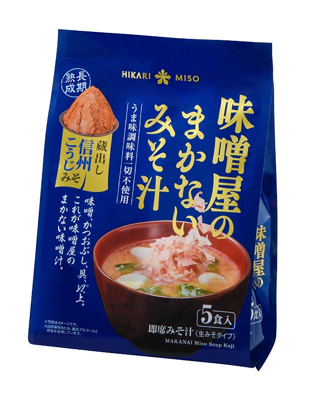 三年以上の長期熟成味噌󠄀を贅沢に使った即席みそ汁。味噌󠄀のおいしさを引き出す「味噌󠄀、かつおぶし、具」の究極にシンプルな設計。