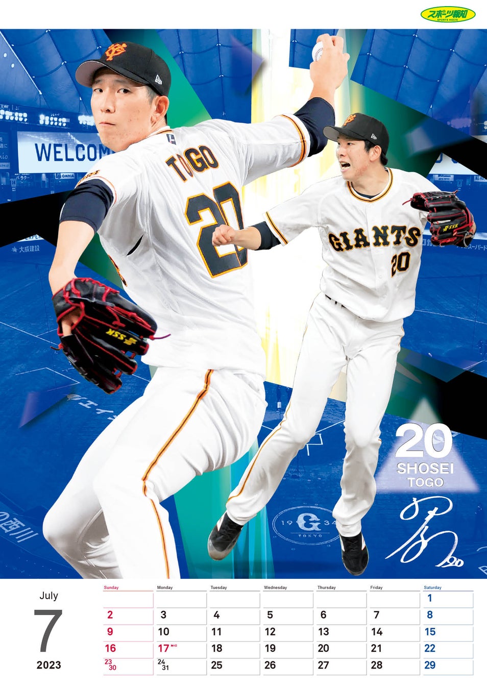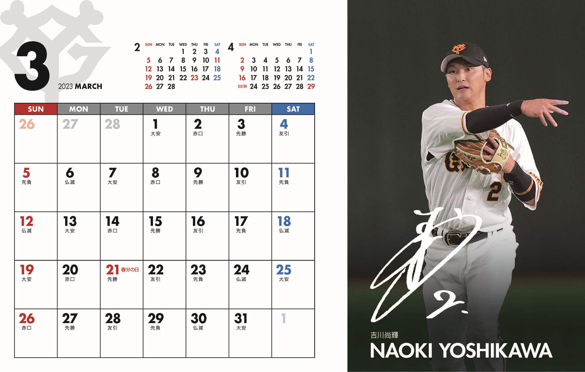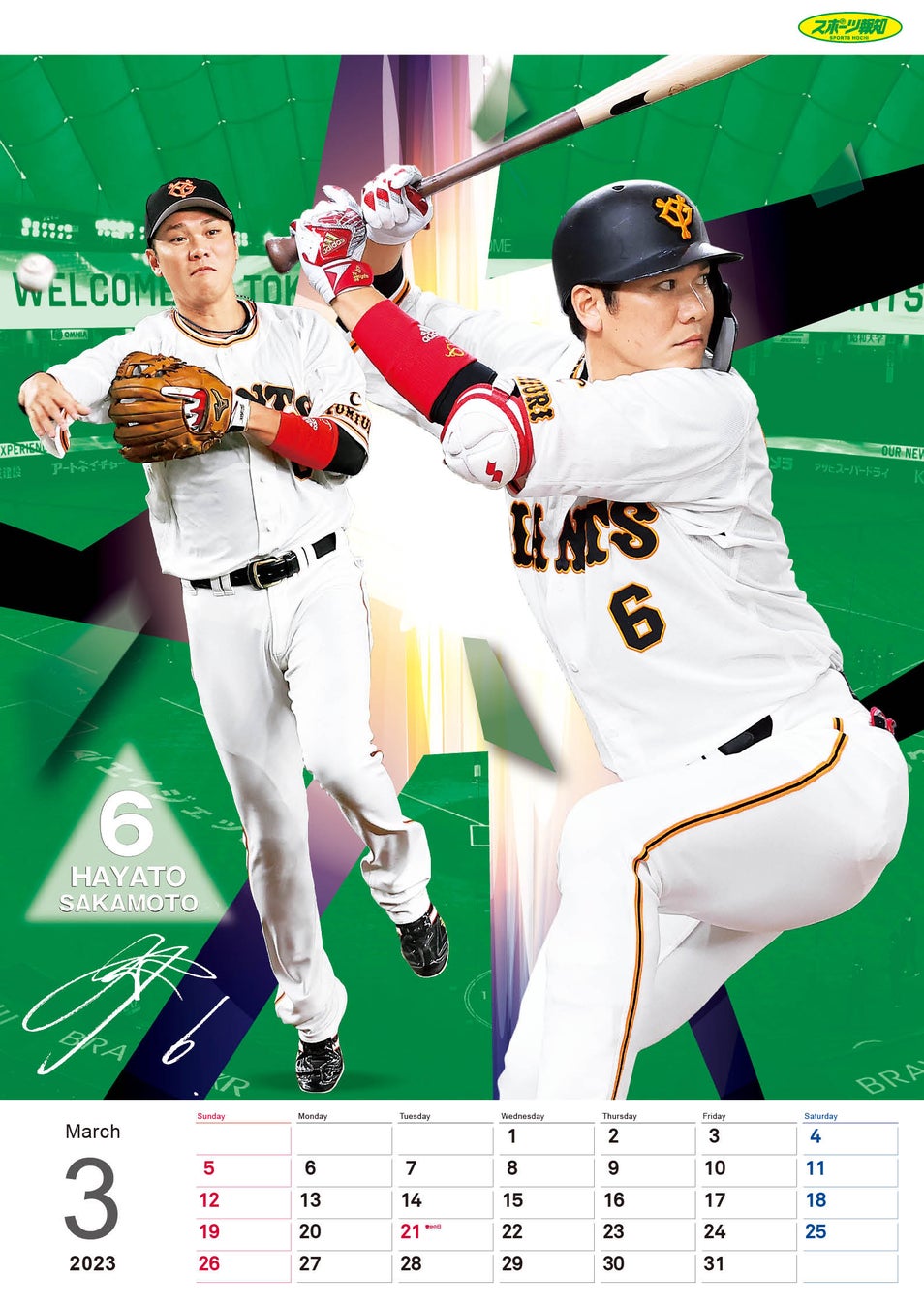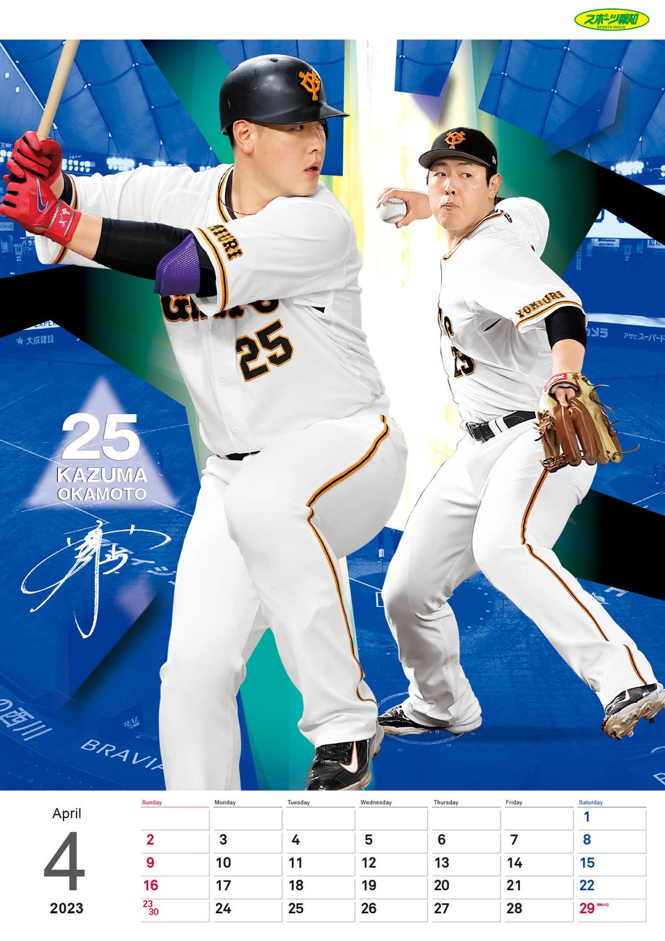 掲載選⼿(敬称略):扉・原監督/1⽉・菅野/2⽉・吉川尚/3⽉・坂本/4⽉・岡本/5⽉・丸/6⽉・小林、大城/7⽉・戸郷/8⽉・大勢、高梨/9⽉・平内、山﨑伊/10⽉・中田、ウォーカー/11⽉・中島、松原/12⽉・中山礼、増田陸