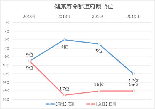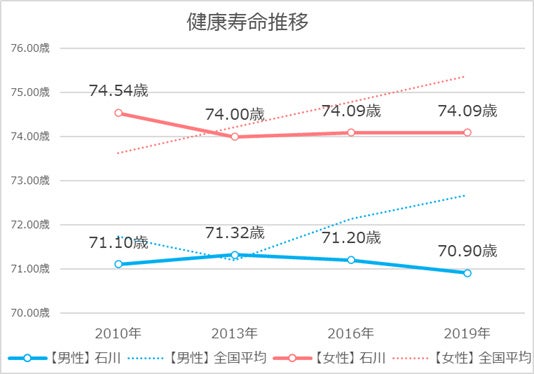 厚労省簡易生命表の発表によると、石川県は、2010年に男女ともに9位でしたが、現在は男性12位(70.9歳)女性については16位(74.09歳)に下がってしまっております。(以下グラフ参照)