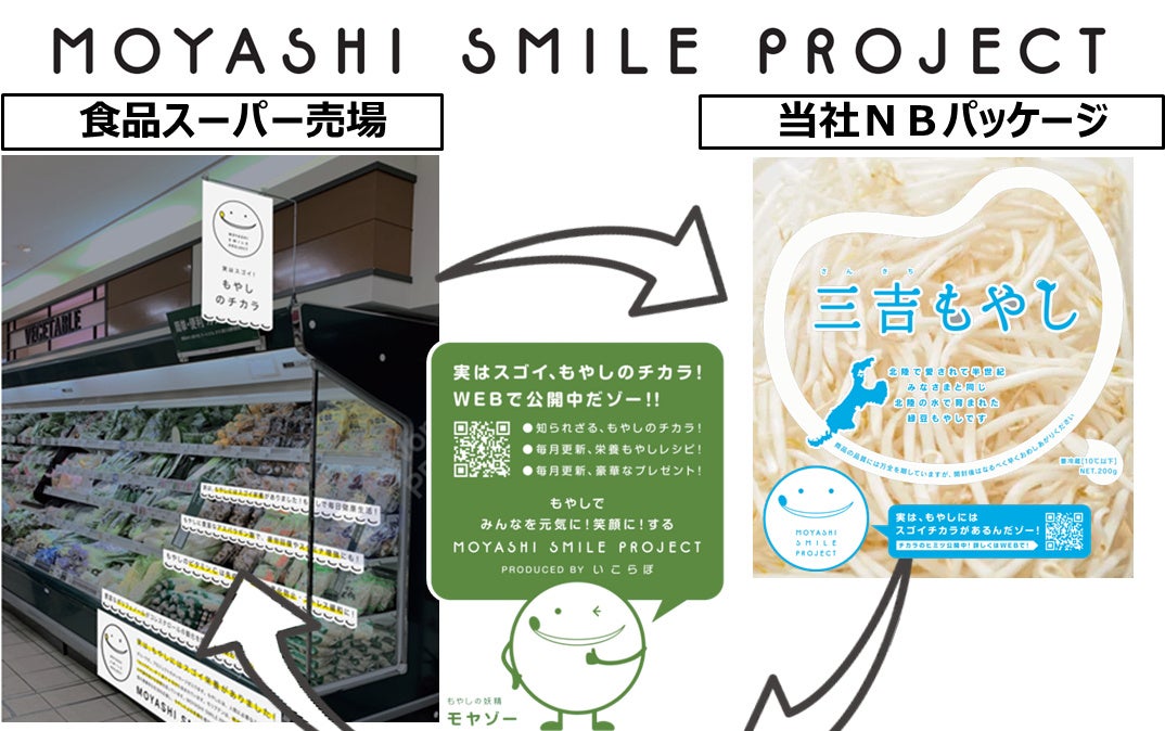 当社は、主に石川県内の食品スーパー約150店でもやしを販売しております。このたびもやしパッケージデザインを刷新、記載のQRコードからアクセスするMSPサイトにおいて、もやしに含まれる栄養素と一緒に摂取すると良い食材との組み合わせレシピで季節の健康課題解決を提案してゆきます。また、食品スーパー店頭POPにおいても発信することで、食品スーパーの売上拡大に寄与するとともに、停滞している北陸の健康寿命延伸にも貢献してゆきます。