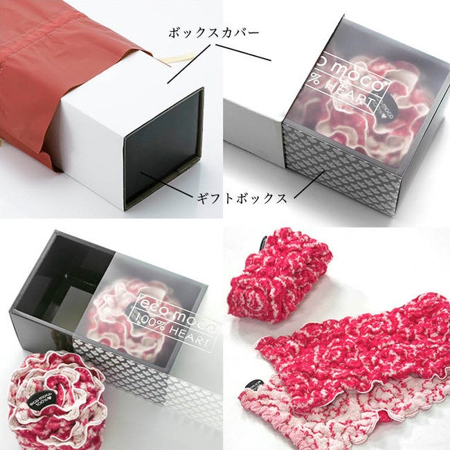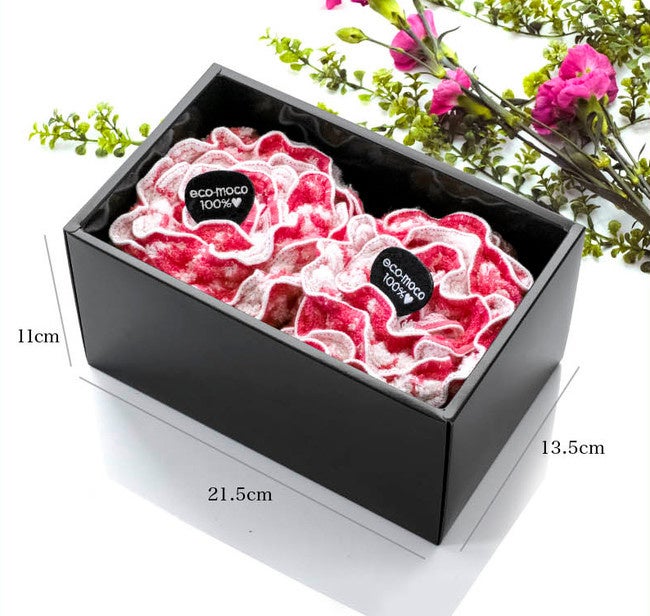 お花をかたどった エコモコオリジナル、モコモコ今治 フェイスタオル 2枚 セット ギフトボックス入り、 巾着袋ラッピング でお届け。
