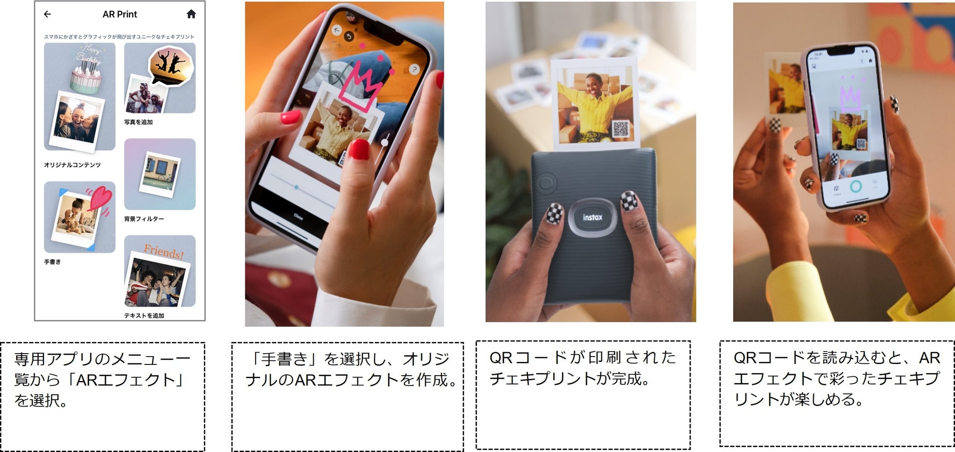 ・チェキプリントとARエフェクトを組み合わせて、感性豊かに表現したり、サプライズメッセージとして活用するなど、チェキプリントの楽しみ方が広がります。