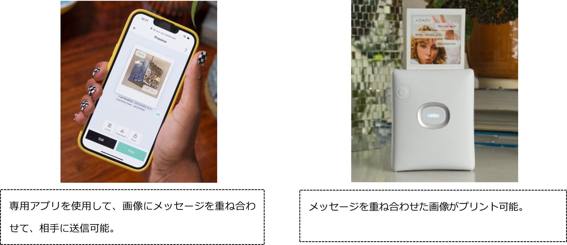 ・専用アプリで、スマホの画像にチャットのメッセージを重ね合わせてプリントできる機能です。スマホの画像をメッセージ付きで送り、さらに相手からの返信メッセージもあわせてプリントすることが可能。写真とチャットを組み合わせたメッセージ付きチェキプリントで、写真を使ったコミュニケーションの楽しさを広げます。記念日の写真をメッセージとともに恋人にプレゼントしたり、子どもの写真にメッセージを添えて離れて暮らす祖父母へ送るなど、離れていても距離を感じさせない、タイムリーでリアルなチェキプリントの新たな楽しみ方を提案します。