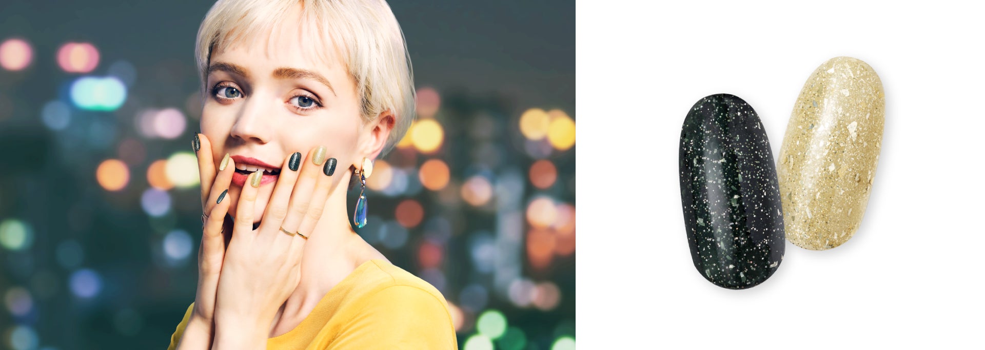 秋の限定カラーとして登場するのは、「踊る、煌めく、恋をする」をテーマにした華やかなラメカラー。ジャズが醸し出す落ち着きのある曲調と空間を表現したグリーンラメカラー「C005 Jazzy(ジャジー)」、空一面に輝く星空の下、歓喜を纏う「イエロードレス」をモチーフにしたイエローラメカラー「C006 Griffith(グリフィス)」(各1,950円)の2色を数量限定で販売いたします。
