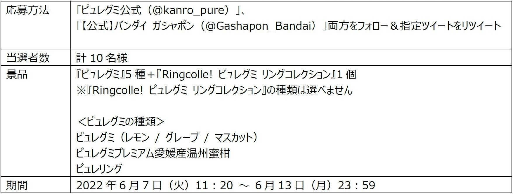 本商品の発売を記念しまして、『#夢に見たピュレグミリング Twitterキャンペーン』を実施します。下記方法によりご応募頂いた方から、抽選で10名様に『ピュレグミ』と『Ringcolle! ピュレグミ リングコレクション』セットをプレゼントいたします。