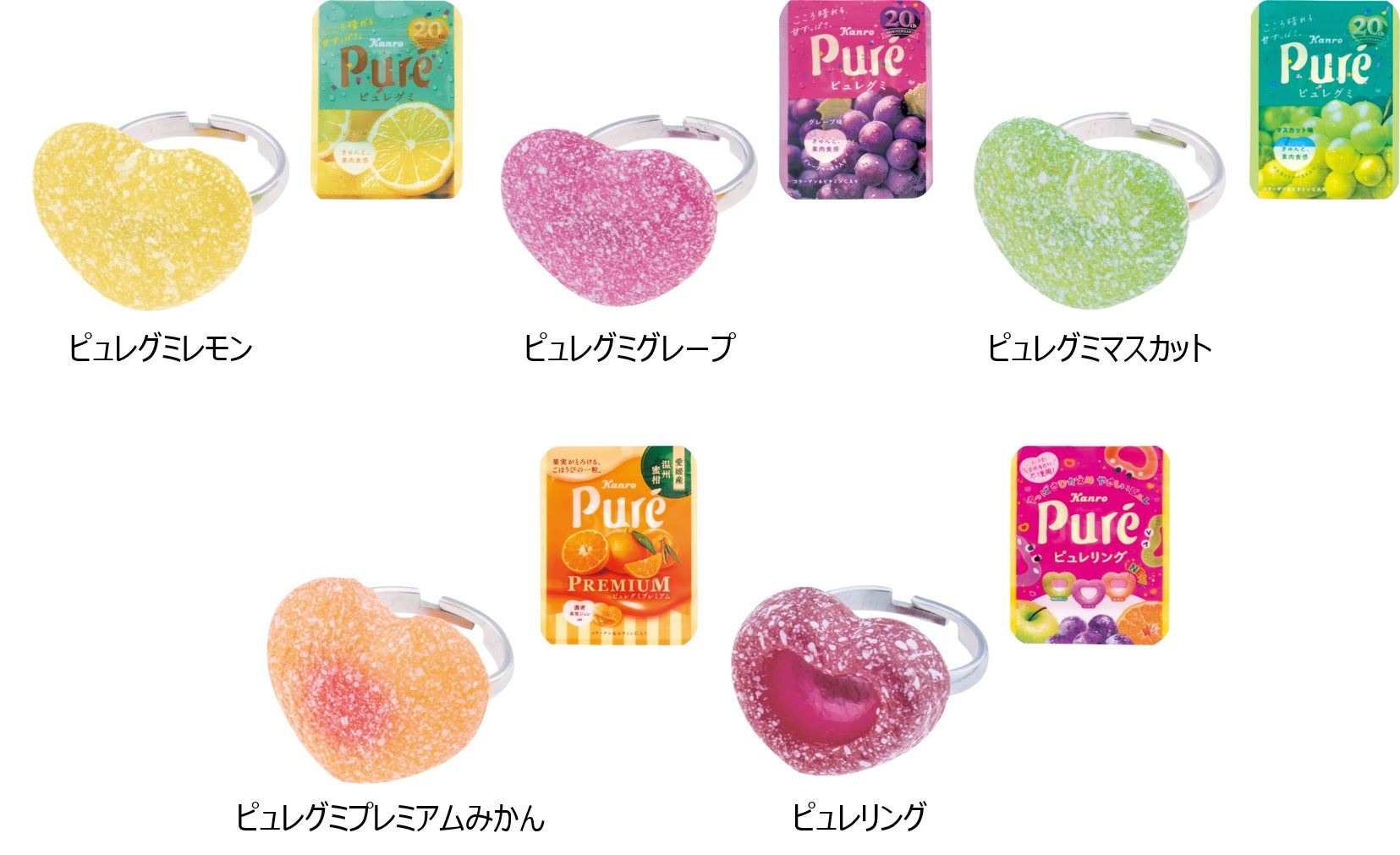 カプセルトイは第5次ブームを迎え、約3,000台のカプセル自販機を設置した専門ショップがオープンするなど近年注目を集めています。本商品は、今年発売20周年を迎えた幅広い世代に愛されている「ピュレグミ」ブランドのグミ粒を指につけられるリングにしました。リングを入れられるパッケージデザインの袋も付属。種類はピュレグミ(レモン/グレープ/マスカット)、ピュレグミプレミアムみかん、ピュレリングの5種とシークレット1種の全6種です。ピュレグミの特徴であるハート型やカラフルなカラーなどを再現しており、全種類集めたくなるようなかわいらしい仕上がりです。