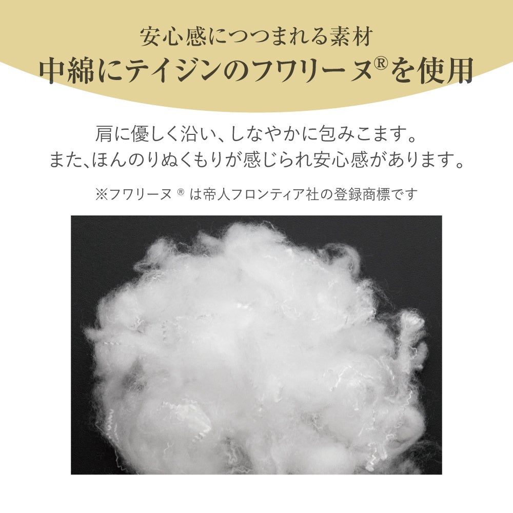 中綿にテイジンのフワリーヌ🄬を使用して肩に優しく沿いしなやかに肩に包み込みます。ほんのりとしたぬくもりによって安心感があります。