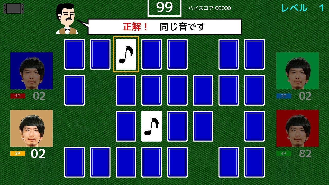 音声を使った神経衰弱です。カードをめくると流れる音を覚えて、同じ”音”をそろえます。レベルが上がっていくと、ピアノの音程を聞き分ける「絶対音感」のステージや、バイク川崎バイクなど特定の芸人の声しか出てこない個性的なステージも登場します。
