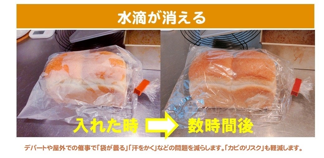 屋外でのイベントや、デパート催事でのパンの販売の際、問題となるパンの水分による袋の曇りや汗を防ぐ効果があります。