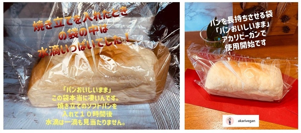 ・屋外イベントで販売の際、従来だと袋の中で蒸気が発生し、袋に入っているパンが何かわからなくなったり、パンが濡れたりしていました。ですが「パンおいしいまま」に入れたパンは、袋の中で発生した蒸気も吸い取ってくれたようです。常連のお客様からは、パンがよりおいしくなったと大変好評いただいています。(パウンドケーキ村様)
