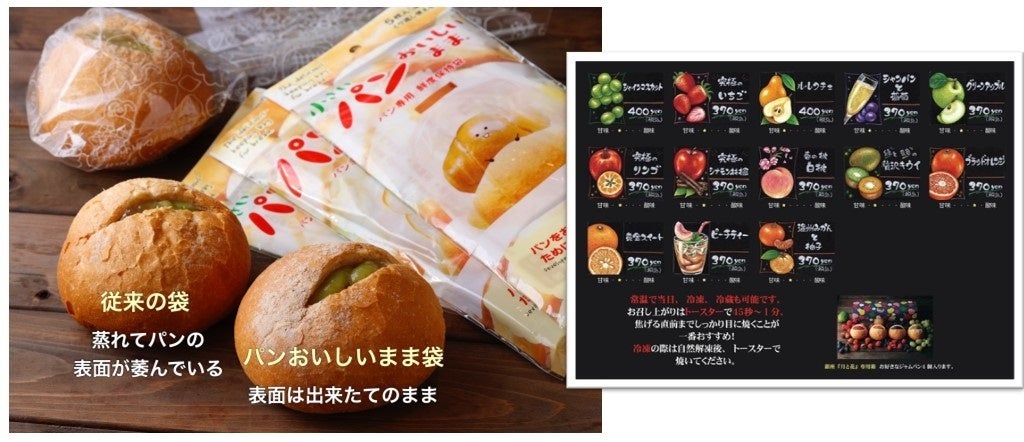・従来の包装形態(PP袋)での通信販売では、「パンとジャム自体の水分で蒸れる霜が出る」「蒸れた水分でパンが萎む」「パンの形が崩れる」などが生じ、お店と同等な品質とお味のジャムパンを提供することが難しいという欠点がありました。しかし、「パンおいしいまま」を使用することで、限りなく出来たてに近いジャムパンが提供できるようになりました。(銀座月と花様)