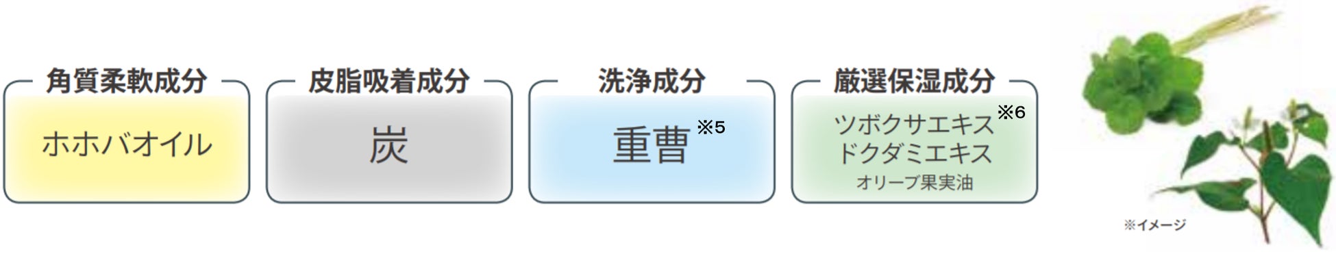 ホホバオイル、ツボクサエキス・ドクダミエキス※6、さらに毛穴に特化した炭や重曹※5も厳選配合。
