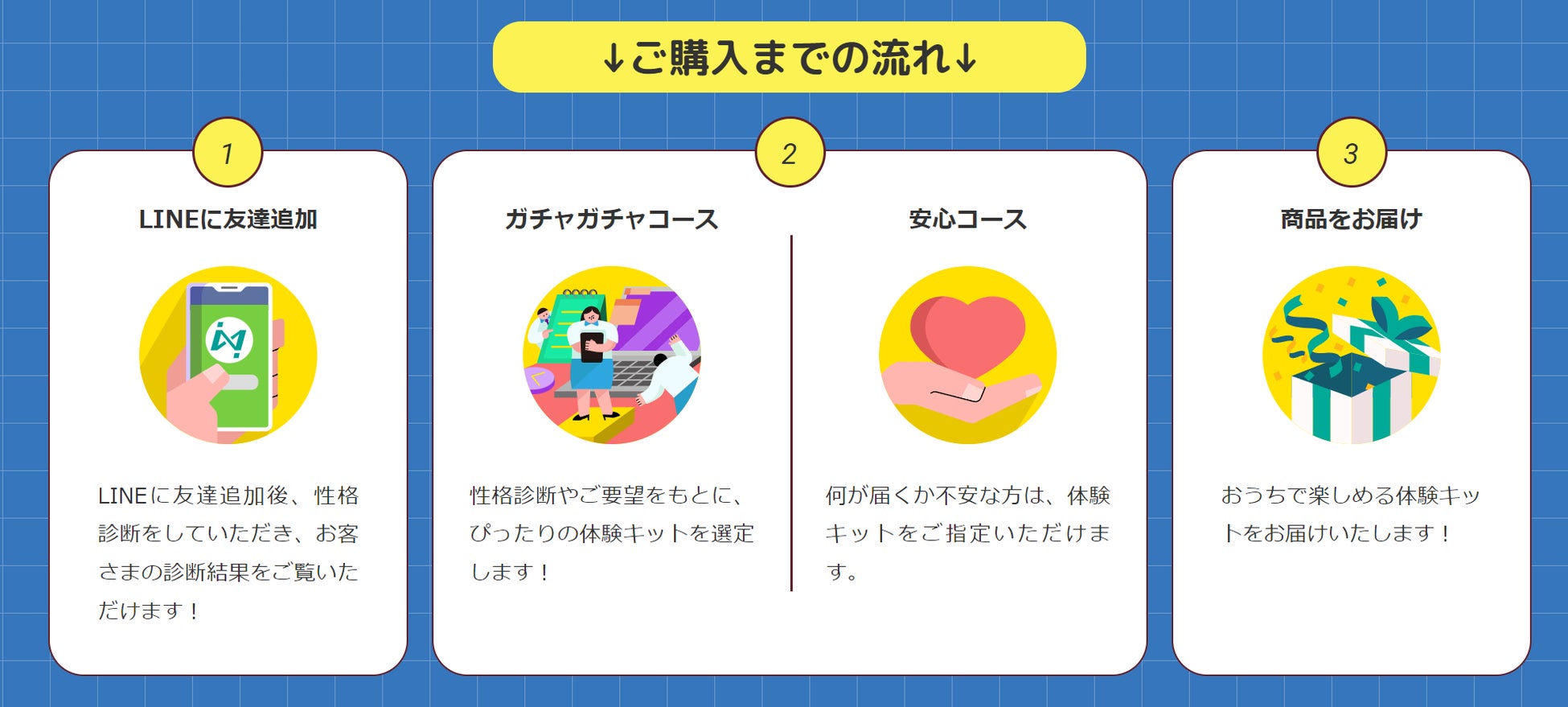 もともとおうちハック!では「おまかせコース」として、お客様にご入力いただいた性格診断と要望を基に、お客様にぴったりな体験キットを選定しサプライズでお届けしてまいりました。