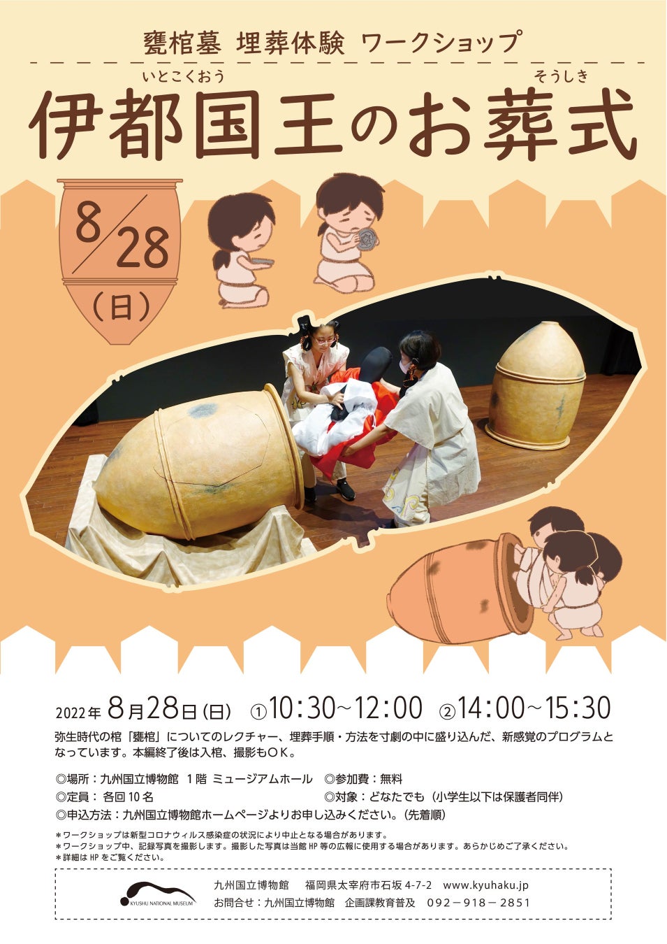 伊都国王の墓といわれる、三雲南小路遺跡から出土した甕棺をモデルにしたレプリカを使用し、亡くなった人を甕棺墓に埋葬するまでの一連の流れを体験するワークショップです。貫頭衣に着替え、レクチャー・埋葬手順・方法を盛り込んだ寸劇に参加しながら学べるプログラムとなっています。本編終了後は入棺、撮影もOK。