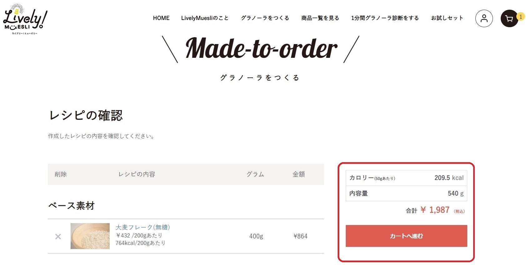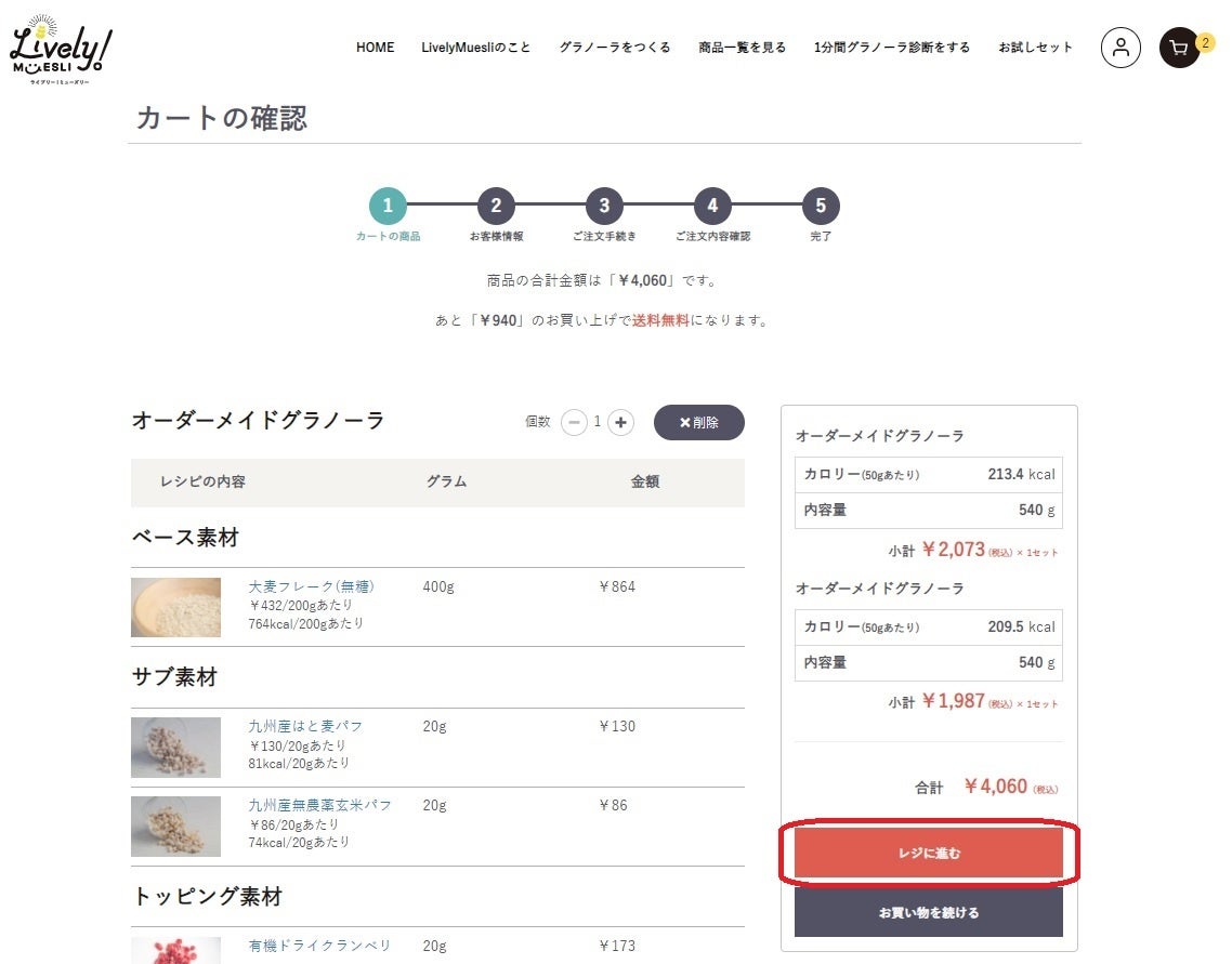 ③オーダーメイドグラノーラの内容を確認し、右下の「レジに進む」をクリック