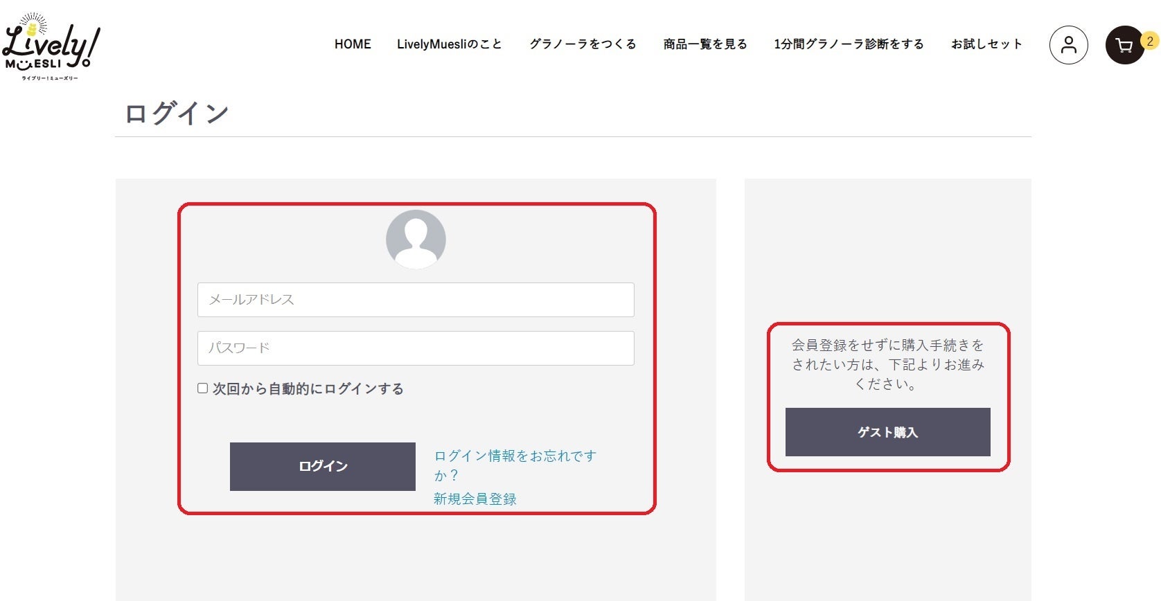 ⑤会員登録をしている方は「ログイン」ボタン、ゲスト購入をご希望の方は「ゲスト購入」をクリックし、情報を入力すれば注文完了です