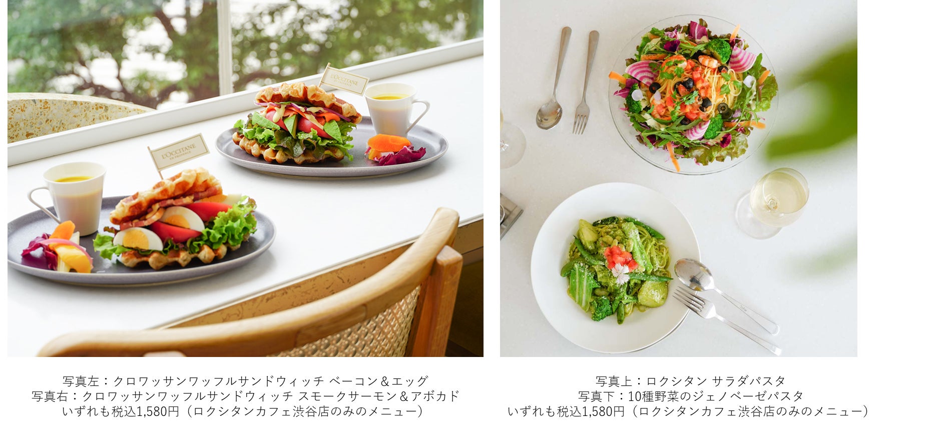 スクランブル交差点に面するロクシタンカフェ渋谷店では、お食事メニューも多数新登場!おすすめは、話題のクロワッサンワッフルを使用した「クロワッサンワッフルサンドウィッチ」。発酵バターを使用したクロワッサンワッフルに、厚切りベーコン・ゆで卵・トマトをサンドしたメニューと、スモークサーモン・アボカド・トマトをサンドしたメニューの2種類が登場します。ワッフルのバターの香りとほんのり甘くサクッとした食感に、野菜やベーコンのジューシーさが加わる、五感で楽しめる満足感の高い一品です。