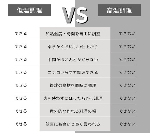 その名の通り、低温調理器とは適当の低温にキープしながら、食材をじっくりと加熱する調理器具のことです。美食の地とも呼ばれるフランスが発祥の地とされており、プロ並みな温度管理が求められる調理法を用いて、健康的な食生活を手軽に楽しめることができます。