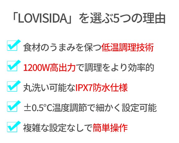 そこで強くお勧めしたいのがこちらの低温調理器「LOVISIDA」です。