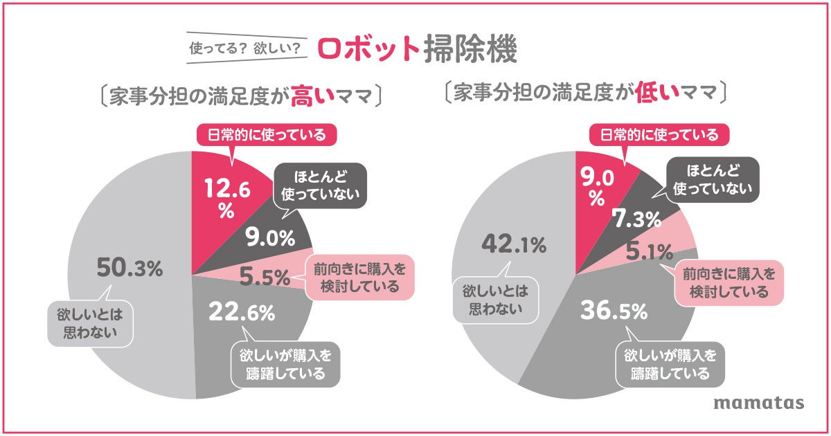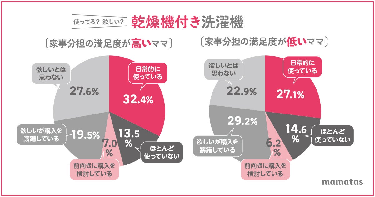 一方、家事分担の満足度が低いママは「欲しいが購入を躊躇している」人が多い結果に。「日常的に使っている」人の割合も、満足度の高いママより低めで、夫にも家電にも頼りきれていないことが、分担満足度の低さにつながっているようです。