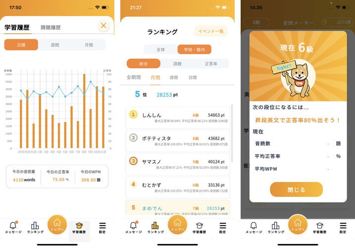 英語の音読学習は「継続」が大切。そのために、ユーザーにストレスがかからないようなUI/UXを実現しました。また、学習を継続する仕掛けとして、音読量や正答率に応じた昇段判定、全国、塾・予備校内でのランキングを用意。モチベーションアップにつながります。