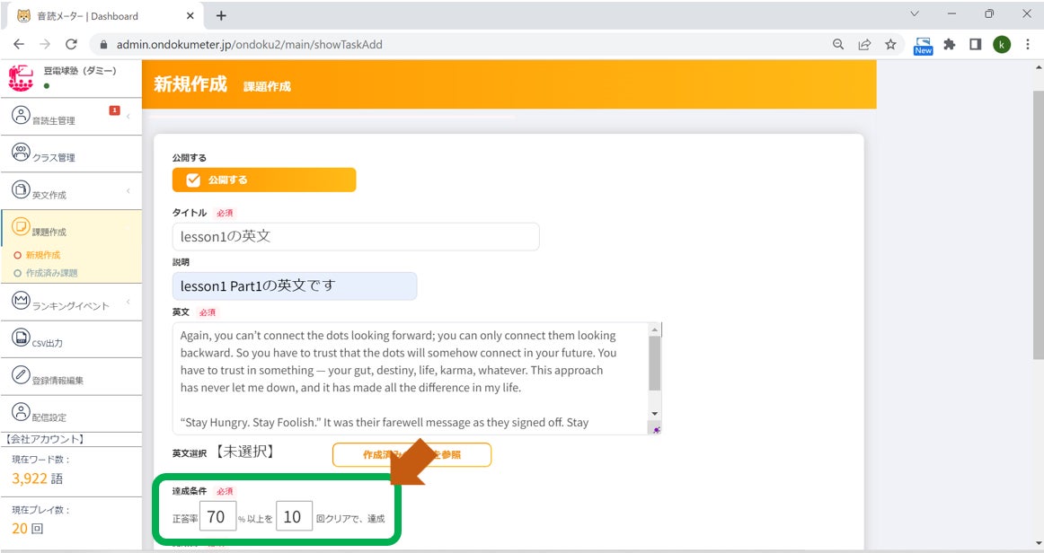 学校や塾の先生方が音読指導しやすくなり、生徒は家庭での音読習慣を身に付けられるような仕組みを取り入れています。その1つが「課題機能」。学校の教科書・塾予備校のテキストの英文を課題として配信。指定した回数・正答率をクリアーすると課題が完了となるゲーミフィケーション機能です。