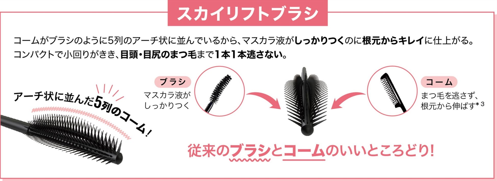 新製品「スカイハイ」は、日本人の下向きまつ毛も、伸ばしてリフト*3することで、ぱっちりロングな仕上がりを叶えるマスカラです。その秘密は、史上初*1の「スカイリフトブラシ」。5列のアーチ状に並んだコームが従来からあるブラシとコームの利点いいところどり!まつ毛の一本一本を逃さず、しっかりとマスカラ液をつけながらも根元からきれいにリフト*3します。また配合しているリフト*3ロックフォーミュラをまつ毛に密着させることで、自然なリフト*3(上向きまつ毛)を一日中キープ*2。さらにウォータープルーフで汗や水にも強く、まつ毛を守る補修成分*4も配合されています。
