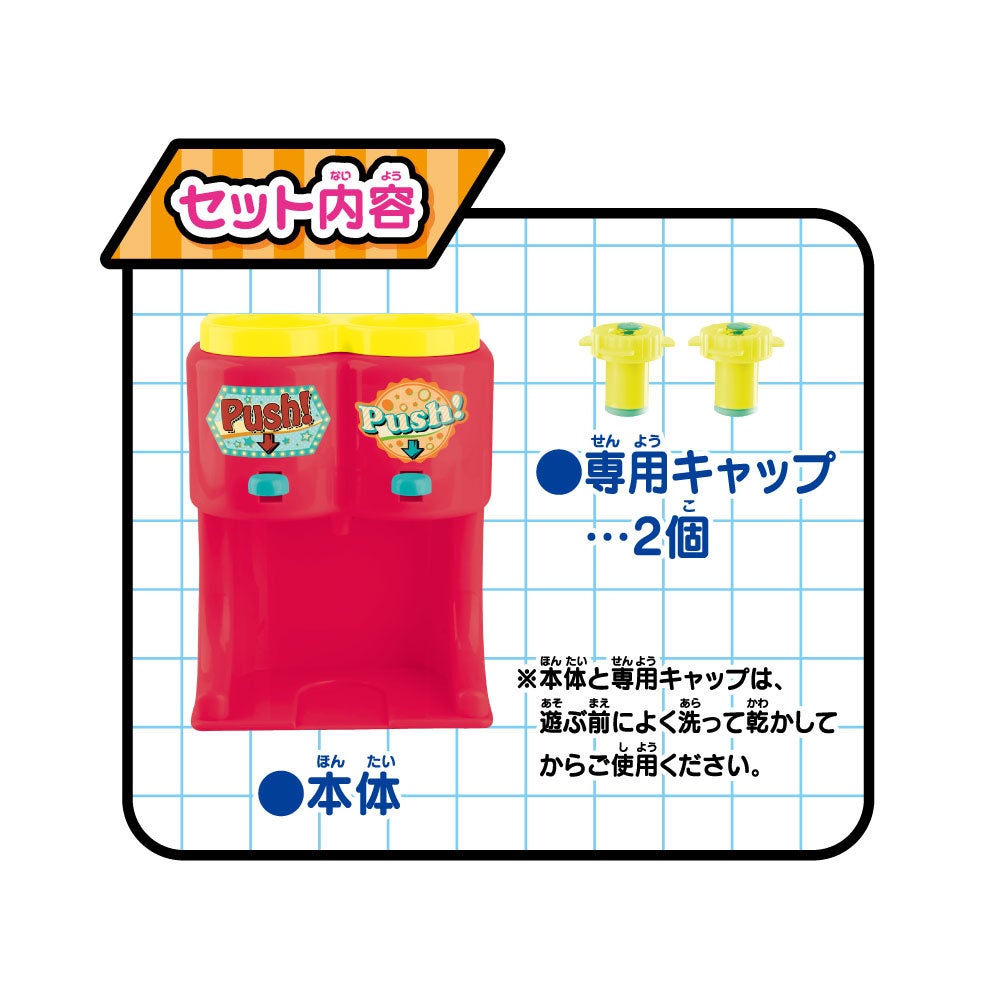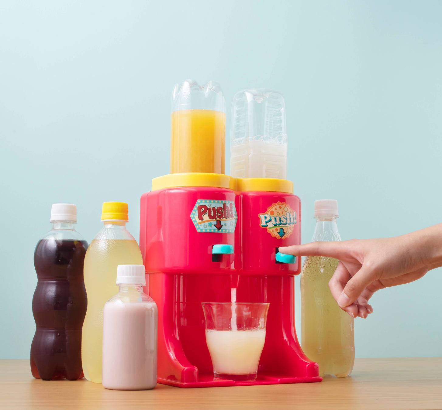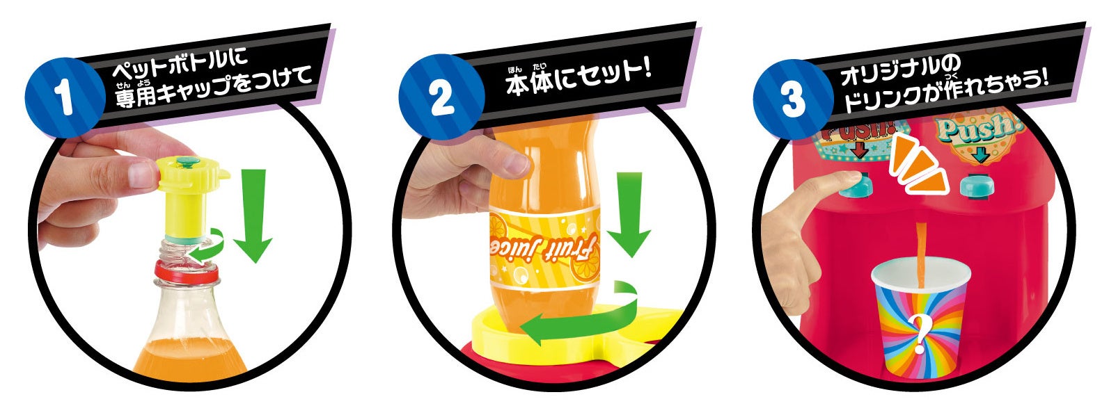 本商品は、ドリンクの入ったペットボトルに専用キャップをつけて本体にセットし、レバーを押すだけでドリンクバーのように注ぐことができる新感覚クッキングトイです。