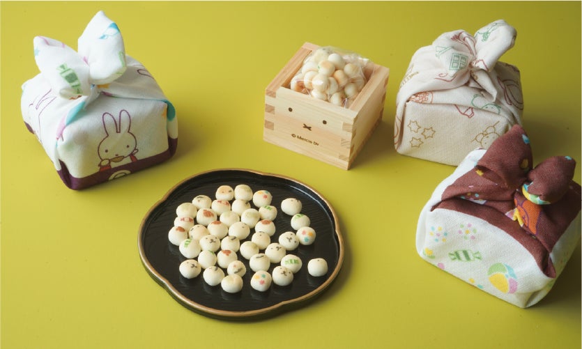 キャプション:はんかちを解くと、ひのきの枡に入ったたまごボーロが現われます。ちいさなボーロには一粒一粒にキャラクターのプリントをあしらいました。枡にはミッフィーのお顔焼き印が施され、はんかちは洗ってお使いいただけます。ご賞味後も長く楽しめるアイテムです。