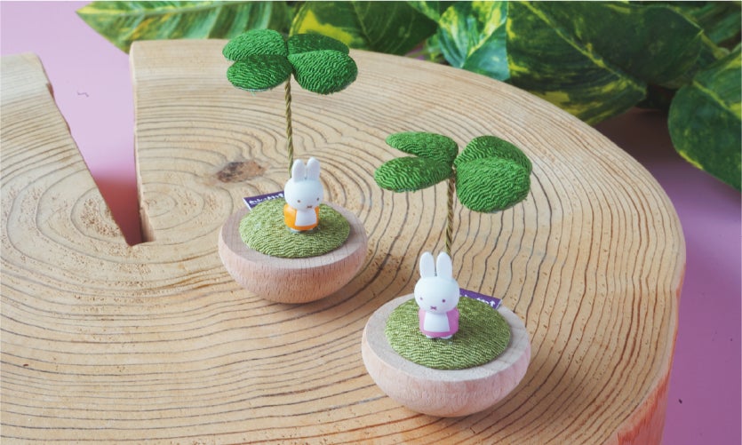 キャプション:しあわせの四つ葉クローバーとミッフィーがゆ~らゆら。ちりめん生地と天然木のやさしさも相まって、最高のなごみグッズ間違いなしです。デスクやお部屋の片隅に置いて、毎日のひとときに。
