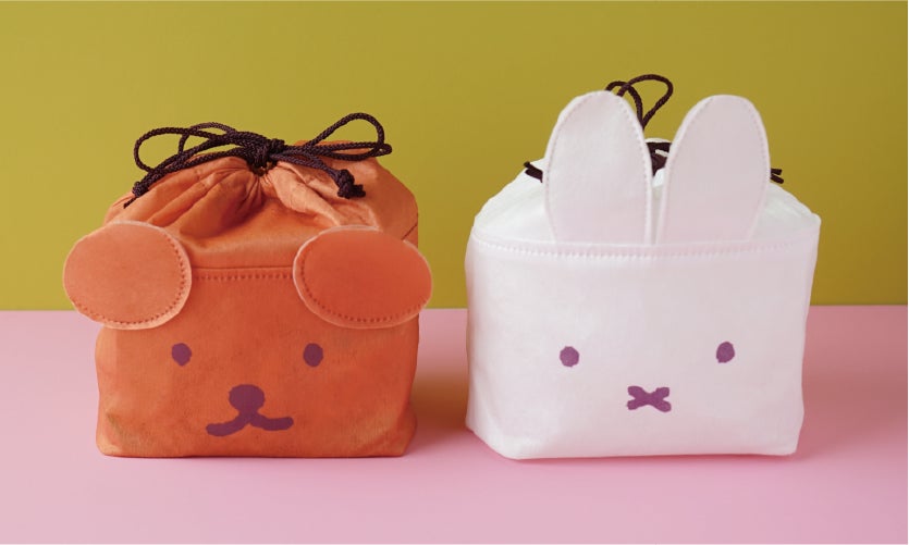 キャプション:ミッフィーとスナッフィーが、ほどよいサイズの巾着になりました。こちらの巾着にはお好きな「あられ・おかき」を3パック詰めてお買い上げいただけます。巾着単品での販売も承っておりますので、ちいさなおやつ入れなどにも使ってみてくださいね。