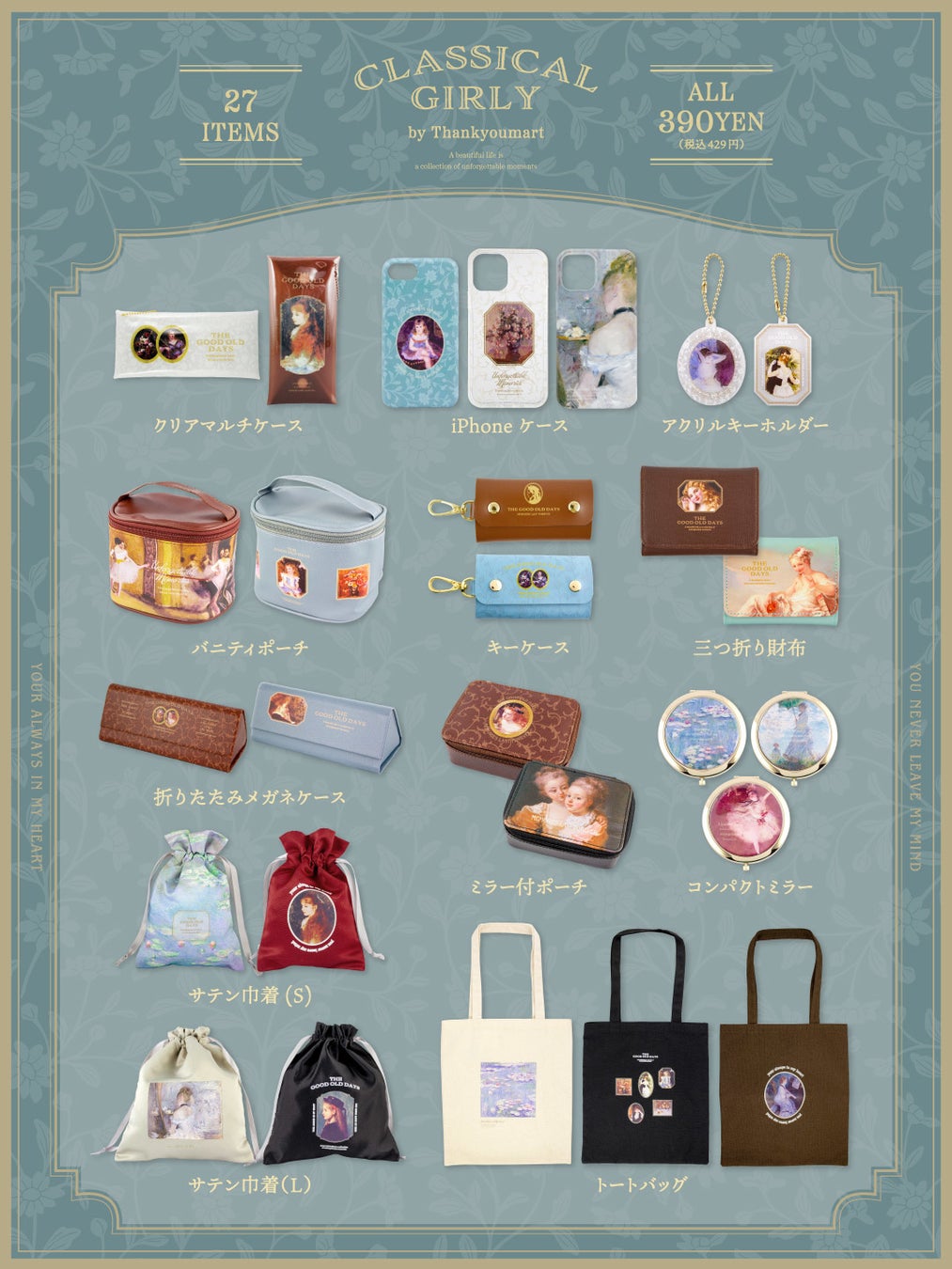 サンキューマートが独自に企画した完全オリジナルデザインの商品シリーズ「サンキューマートオリジナル雑貨シリーズ」より、時代を超えて、世界中で愛され続ける名画をモチーフにした新作『クラシカルガーリー』を販売します。いつの時代にも色褪せることのない魅力を持つ11アーティスト、24枚の名画にインスパイアされたデザインで、日常でもクラシカルな雰囲気を感じられるような全27アイテムを展開します。