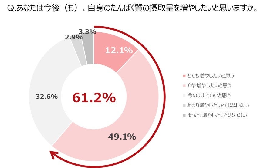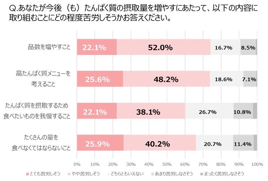 一方で、ウェルネス総合研究所が2022年に実施したたんぱく質摂取量に関する意識調査(n=2,472)では、全体の6割以上(図1)がたんぱく質の摂取量を増やしたいと思っており、全体の7割以上がたんぱく質を増やすために高たんぱく質メニューを考えることや品数を増やすことは難しいと考えている(図2)ことが判明しました。