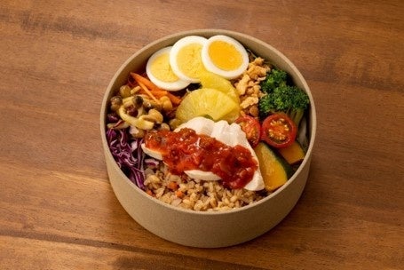 鶏むね肉や、ミックスビーンズ、ゆで卵、大豆ミートを具材にたんぱく質がしっかり摂れるサラダボウルです。成人女性が1日に必要なたんぱく質70%をカバーします※1。鶏むね肉にはピリ辛のトマトサルサソースを合わせ、全体を混ぜるとパイナップルの酸味がプラスされるなど、さまざまな味を楽しめます。このサラダボウルで1日の野菜摂取目標量の1/2の量を摂ることができ、もち麦ごはんによってしっかり満足感が得られる一品に仕上げました。この時期、健康力を高めるためのたんぱく質を摂りたい方におすすめのメニューです。 *メニューには森永乳業「タンパク生活」は使用されていません。