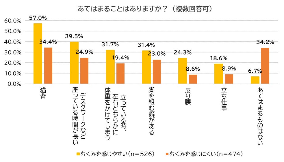 今度は、「むくみを感じやすい」(「感じる」「やや感じる」と回答した)女性と「むくみを感じにくい」(「あまり感じない」「感じない」と回答した)女性それぞれに「あてはまることはあるか?」聞きました。むくみを感じやすい女性の6割弱が「猫背」(57.0%)と回答したのに対し、むくみを感じにくい女性は3割超(34.4%)と20ポイント以上も少ない結果となりました。更に「デスクワークなど座っている時間が長い」「立っている時、左右どちらかに体重をかけてしまう」「反り腰」など姿勢の悪さにあてはまることは、全てむくみを感じやすい女性の方が10ポイント以上多いこともわかりました。